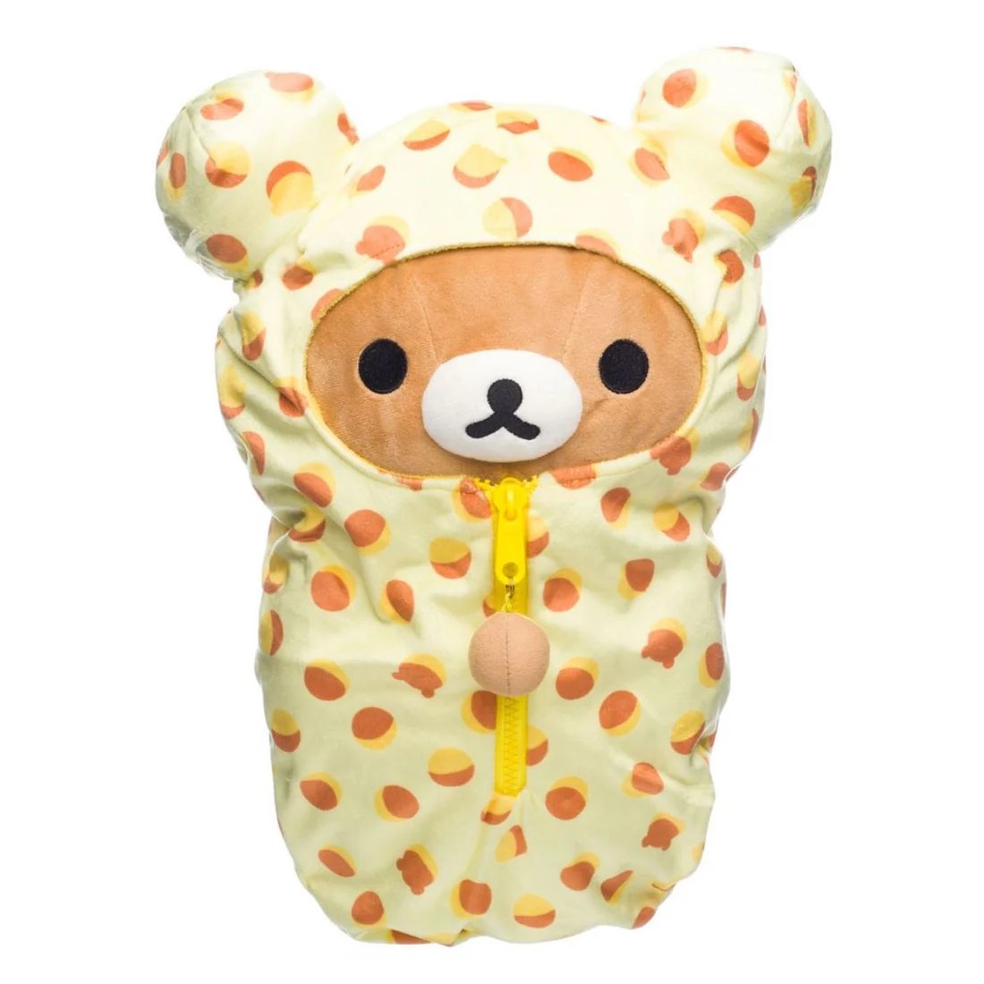 Schattige San-X Rilakkuma plush inclusief zachte slaapzak met een eikeltjespatroon. De lichtgele slaapzak met capuchon en berenoortjes geeft deze Rilakkuma knuffel een extra kawaii uitstraling.