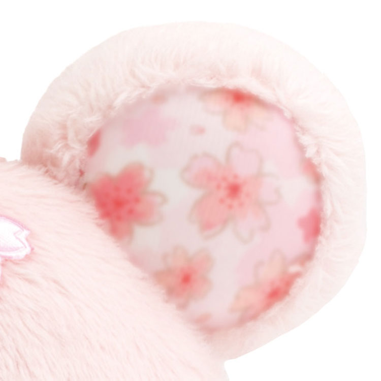 The inside of the ears, the tummy, and the feet are decorated with a subtle cherry blossom pattern. A cute fabric sakura flower is attached to the head and near the tummy.