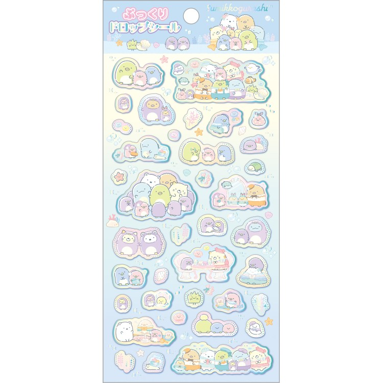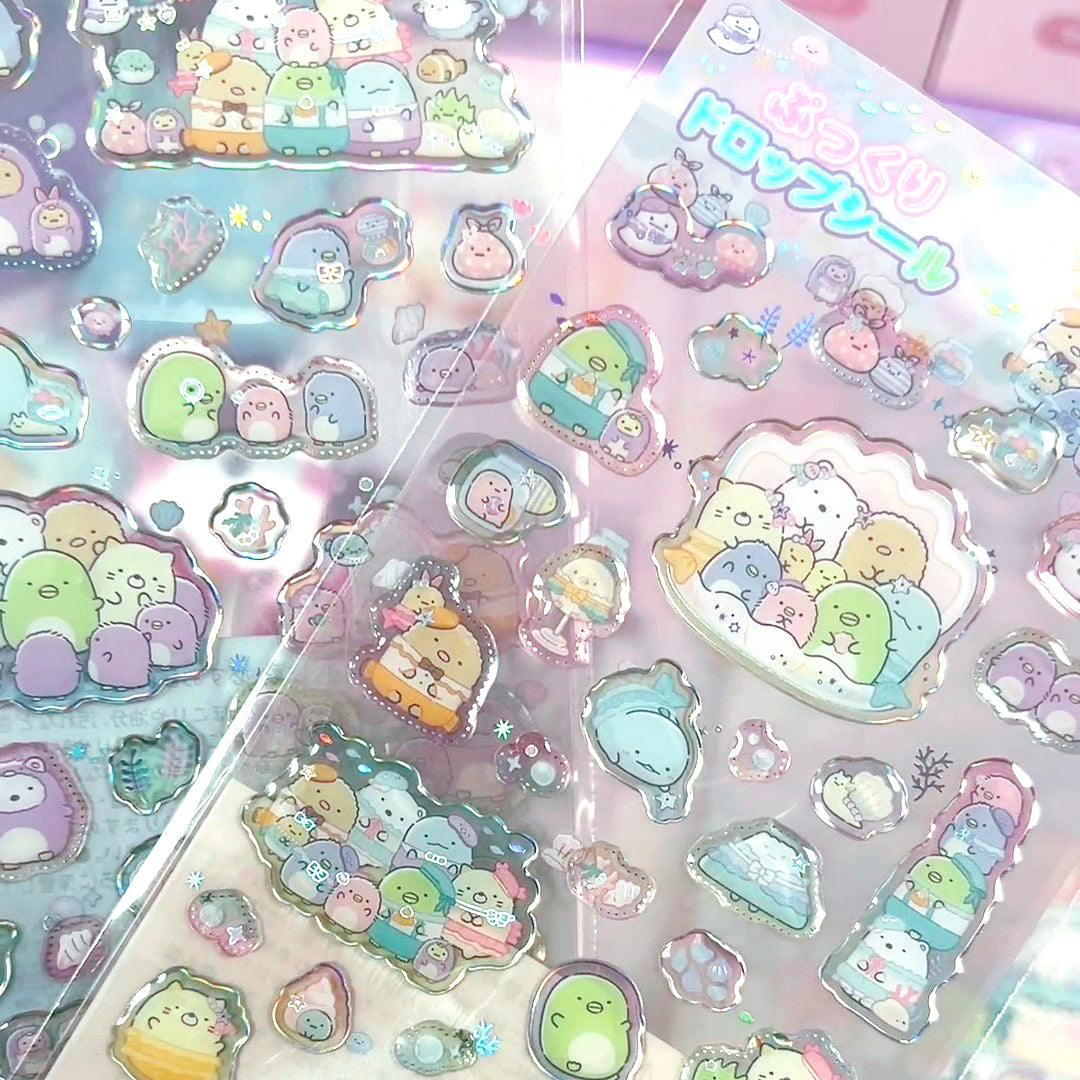 A sticker sheet packed with beautiful Sumikkogurashi stickers with sparkling glitter. These adorable stickers resemble drops. Perfect for giving your belongings a kawaii touch.